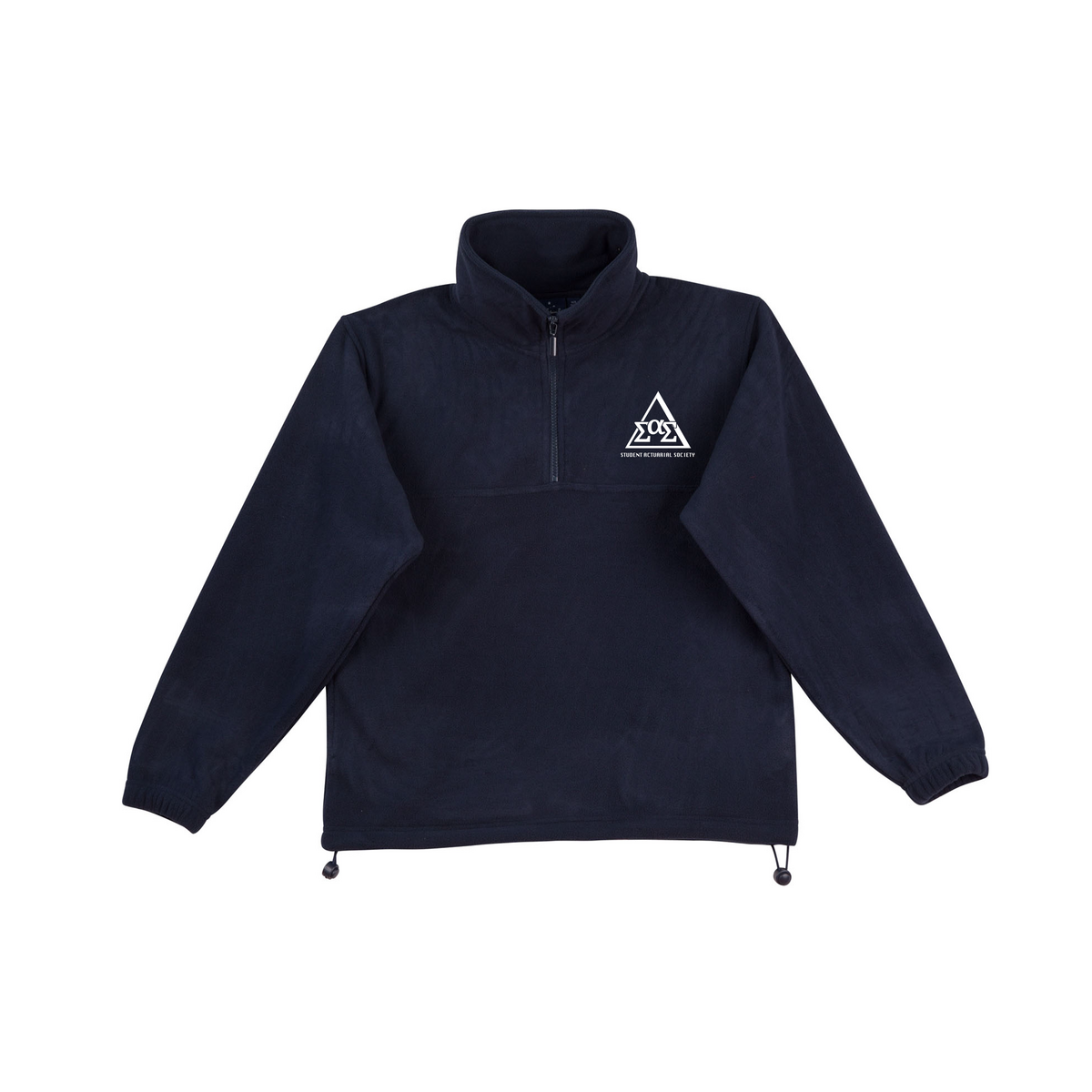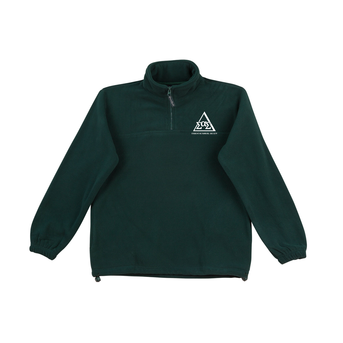 Available in bottle (green) and navy (blue) the SAS 1/4 Zip . The 1/4 Zip features an EMBROIDERED SAS Logo, with the words "Student Actuarial Society" underneath in a bold font.