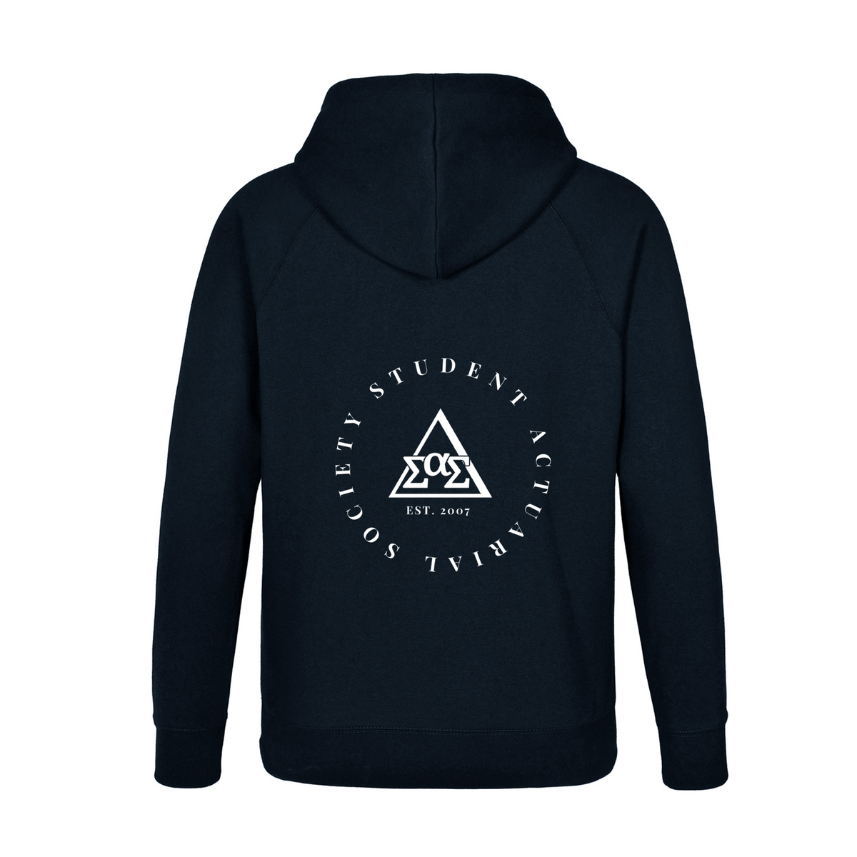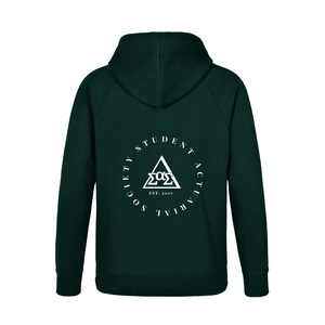 Available in bottle (green) and navy (blue) . The Hoodie features a large EMBROIDERED back placement consisting of the SAS Logo with the words "Student Actuarial Society" wrapping around.